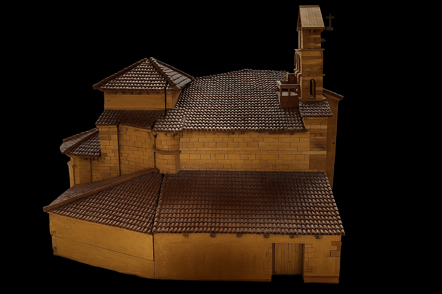 La maqueta que tenemos ante nosotros representa la iglesia de San Juan de Nogales de Pisuerga, una localidad situada a unos diecisiete kilómetros de Aguilar. Los orígenes del lugar son difíciles de precisar, aunque su nombre aparece a comienzos del siglo XIII en la documentación del monasterio de San Salvador de Oña, donde se menciona a un testigo procedente de esta población.