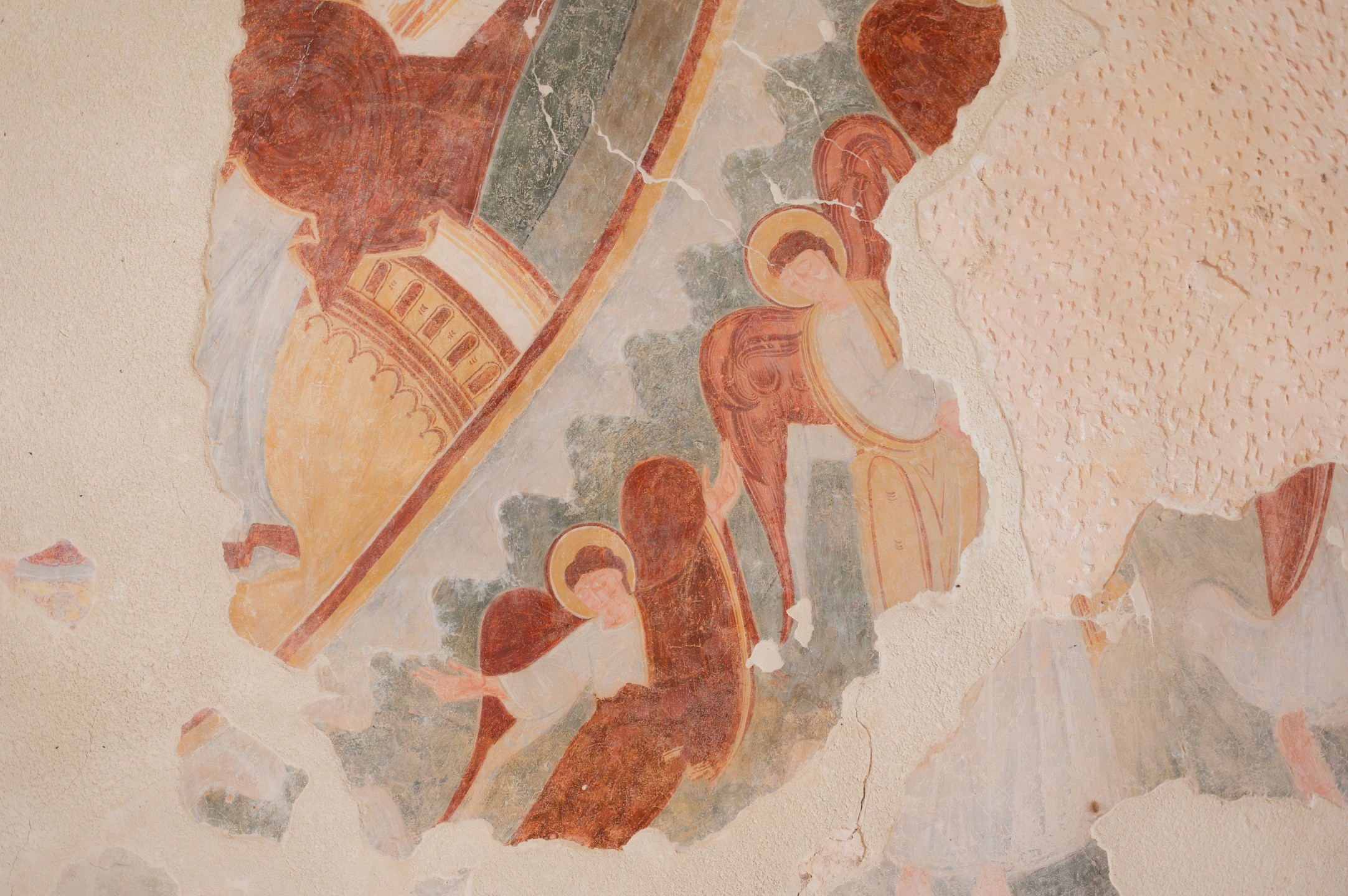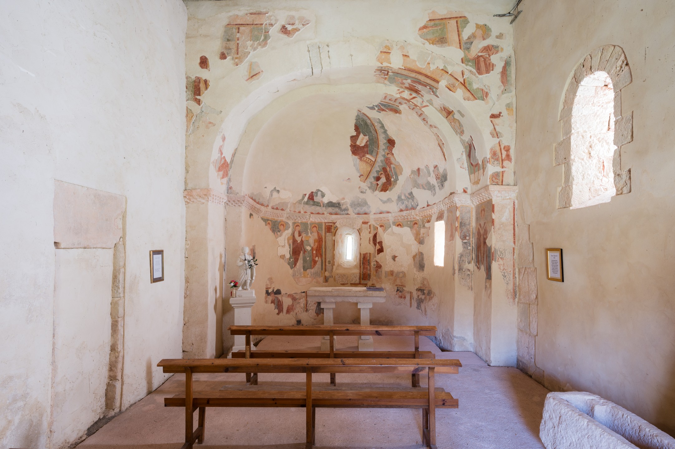 Sin embargo, el verdadero tesoro de la ermita de Perazancas se encuentra en su interior: los restos de pintura mural románica, fechados en el siglo XII, casi únicos en toda la provincia. Aunque el conjunto no se conserva completo, refleja con gran claridad la cosmovisión medieval. En el ábside se representan las escenas del mundo celestial, presidido por un Pantocrátor; en la zona intermedia, los apóstoles, intercesores entre el cielo y la tierra; y en la parte inferior, el mundo terrenal, simbolizado en un calendario agrícola. El programa se completa con otras escenas, como la historia bíblica de Caín y Abel.