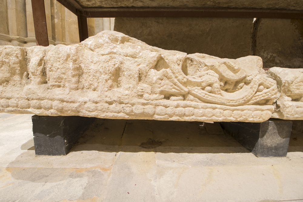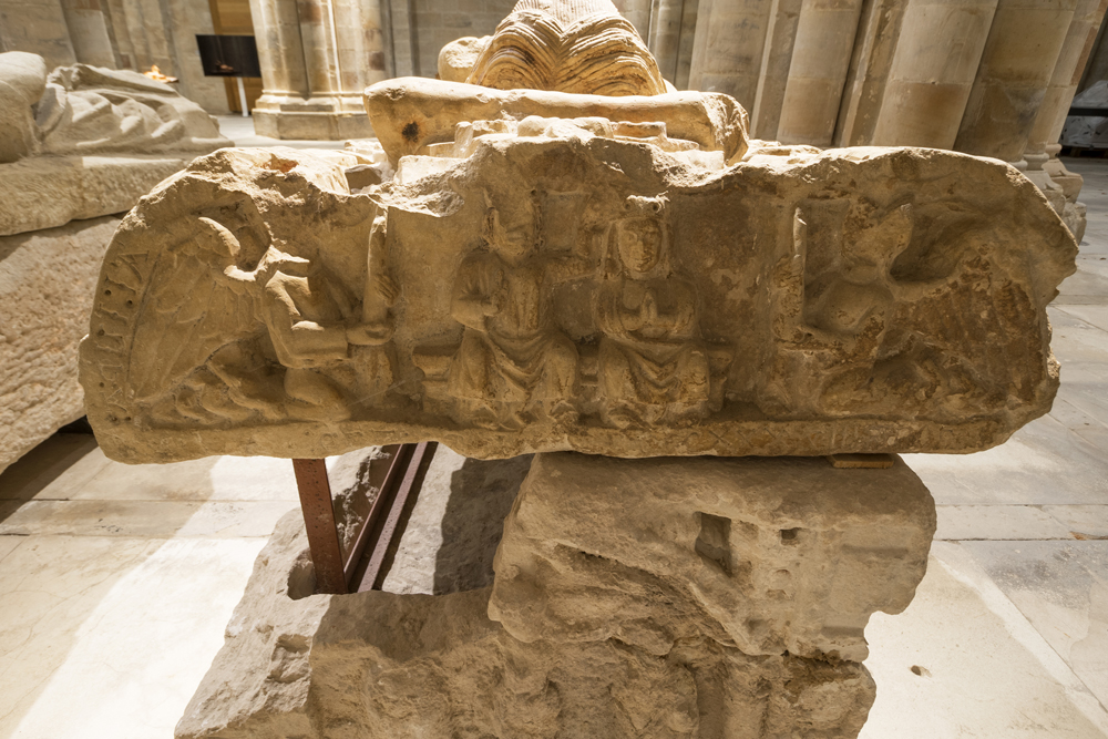 - Sepulcro: el flanco derecho está desprovisto de decoraciones, por lo cual la tumba estaba adosada a la pared por lo menos por este flanco. El lateral opuesto está destruido casi por completo, sin embargo, por el fragmento conservado se intuye que había personajes bajo arcos colocados encima de columnas con basas sólidas. Según la iconografía esculpida en los sepulcros del taller de Carrión de los Condes, el medallón lobulado en el centro del flanco encuadraba la figura del Pantocrátor, de hecho, en la parte inferior izquierda del medallón se identifica un ser alado que posiblemente corresponde a un tetramorfo. En el flanco de los pies, la Crucifixión con la Virgen y san Juan se desarrolla por debajo de un arco apuntado trilobulado que sirve de apoyo a dos torres angulares almenadas. Está muy deteriorada y con dificultad se perciben los volúmenes principales. En la parte central del piñón del testero (cubierta) está esculpida la Coronación de la Virgen por el Hijo. A sus lados, dos ángeles ceroferarios alados salen de las nubes y se arrodillan mirando la escena.