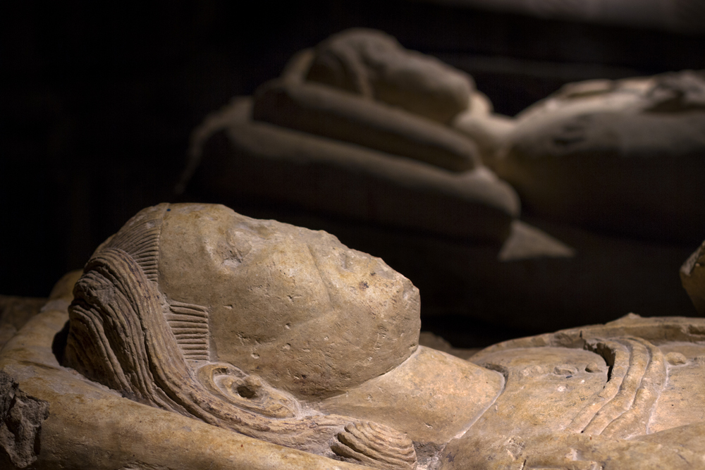 - Yacente: descansa con los ojos abiertos y la mirada hacia el cielo. Los elementos fisonómicos están en buena parte destruidos, se conserva solo el bigote y la barba. Tiene un corte a la moda con cabello partido con terminación en rizos y recogidos detrás de las orejas, y flequillo corto. Viste ropaje de amplios tejidos que en parte se sobreponen a las columnas del enmarque. Lleva un manto de cuerda que cae sobre el flanco izquierdo en pliegues paralelos, mientras que en el flanco opuesto ciñe el costado, cruzando encima del tronco en pliegues en U muy esquematizados. Por debajo, la túnica con cuello ancho tiene botones en la parte central. Le cubre hasta las rodillas. Las mangas con puño y botón se ajustan a los brazos que se doblan encima del cuerpo. La mano izquierda enguantada sobresale del manto, mientras que el brazo derecho cruza encima del estómago y con la mano toca el halcón. Dobla las piernas y en los pies llevaba posiblemente calzado con espuelas.