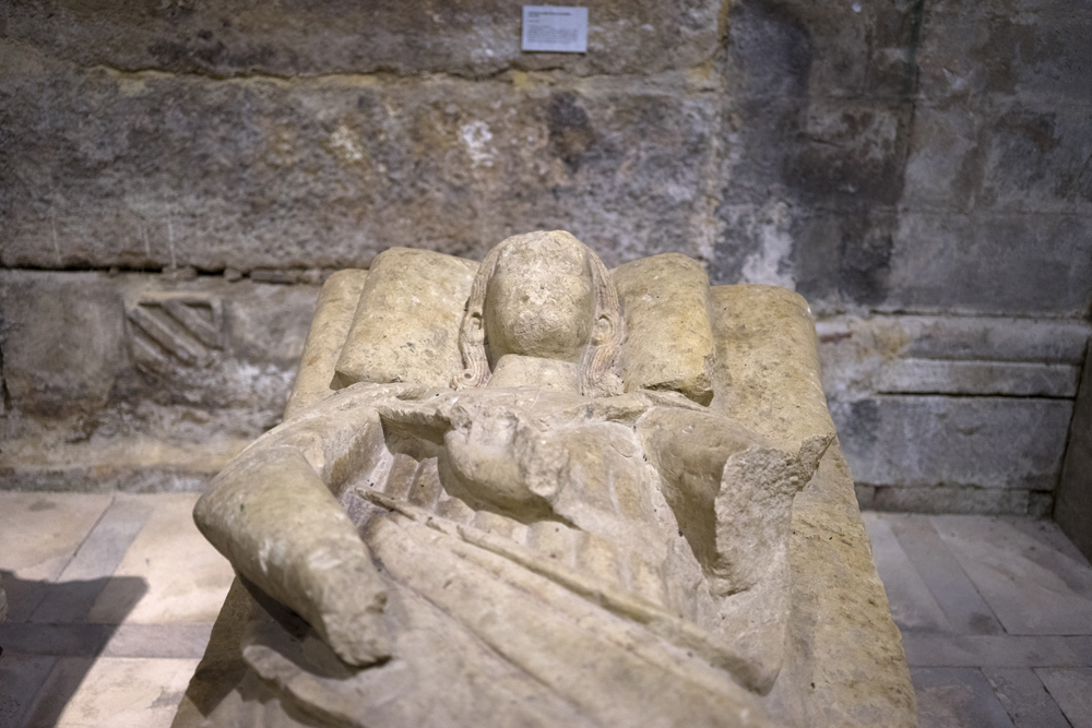 Si se observa con detenimiento, aún pueden apreciarse restos de policromía, algo habitual en los sepulcros medievales, pese a que la imagen actual más común sea la de la piedra vista. Según consta en la inscripción, el sepulcro fue labrado por Antón Pérez de Carrión en 1303, quien también realizó el de su hermano Pedro y probablemente el de Inés de Villalobos. Este artista es, además, la cabeza visible de una excepcional escuela de canteros que trabajaron a finales del siglo XIII, especializados en la talla de sepulcros. Entre sus obras más destacadas, además de las que aquí contemplamos, se encuentran los sepulcros de Felipe de Castilla e Inés Rodríguez Girón en la iglesia de Santa María de Villalcázar de Sirga.