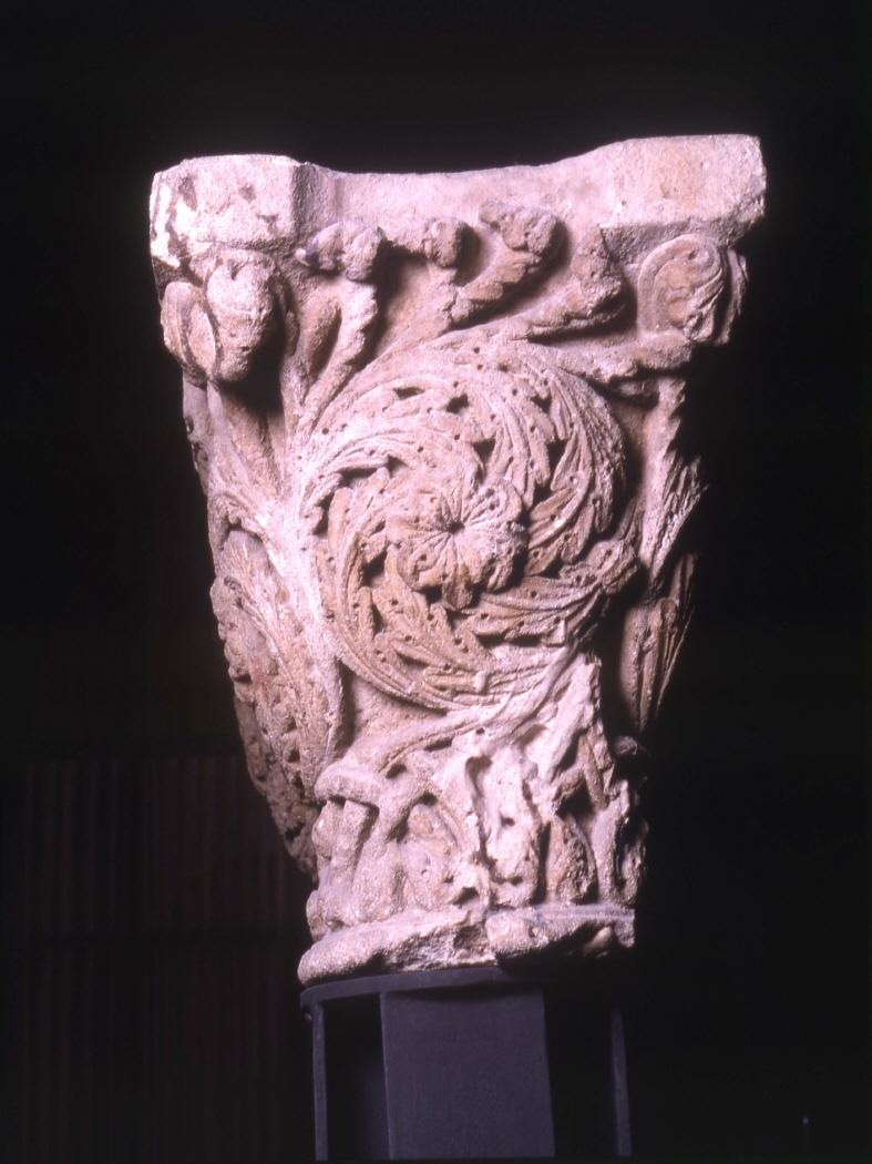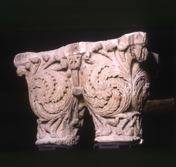 Este capitel doble está decorado por seis hojas de acanto que giran formando un molinillo y, en el centro, llevan una flor de varios pétalos. Recuerda a los modelos vistos en varias iglesias de la zona, como la iglesia de la Asunción de Perazancas de Ojeda, la ermita de Santa Cecilia de Vallespinoso de Aguilar o la iglesia de San Lorenzo de Zorita del Páramo, lo que pone de relieve el papel del monasterio de Santa María la Real como generador de modelos iconográficos que serían transmitidos a canteros locales —probablemente formados aquí— y posteriormente aplicados en los templos de la comarca.