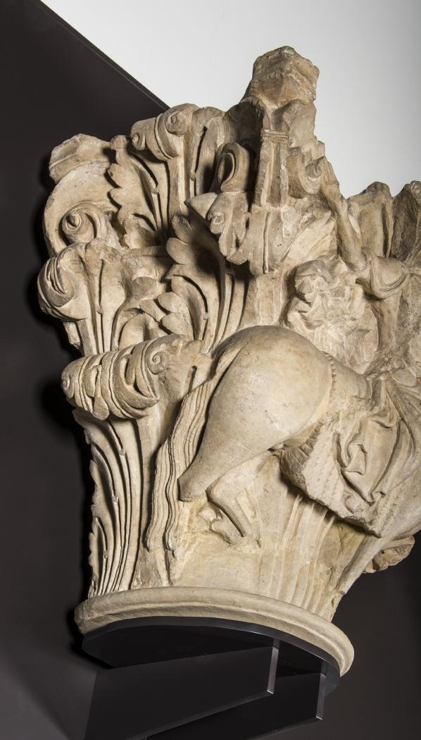 Este capitel sencillo adosado, conocido como el del “caballero victorioso”, es uno de los ejemplares de mayor calidad escultórica del monasterio, y se atribuye al Maestro del Cristo de la iglesia de Santiago de Carrión de los Condes. Tradicionalmente ha estado emparejado con la escena de Sansón desquijarando al león, como se observa en varios ejemplos franceses y en la cercana iglesia de Santa María del Camino de Carrión de los Condes.