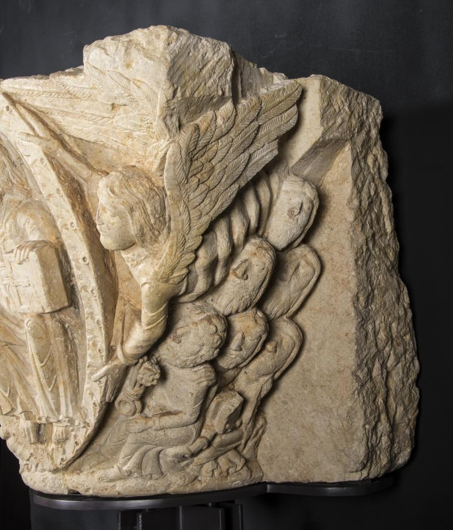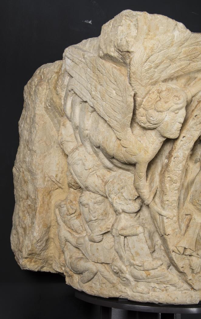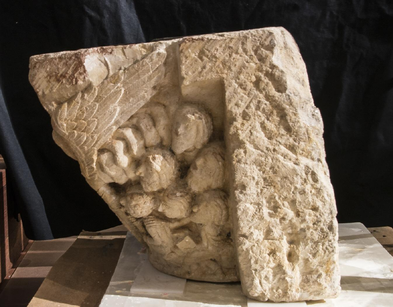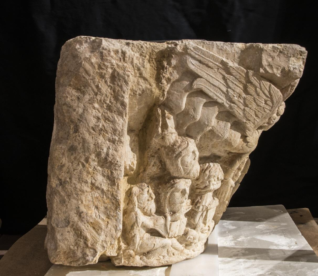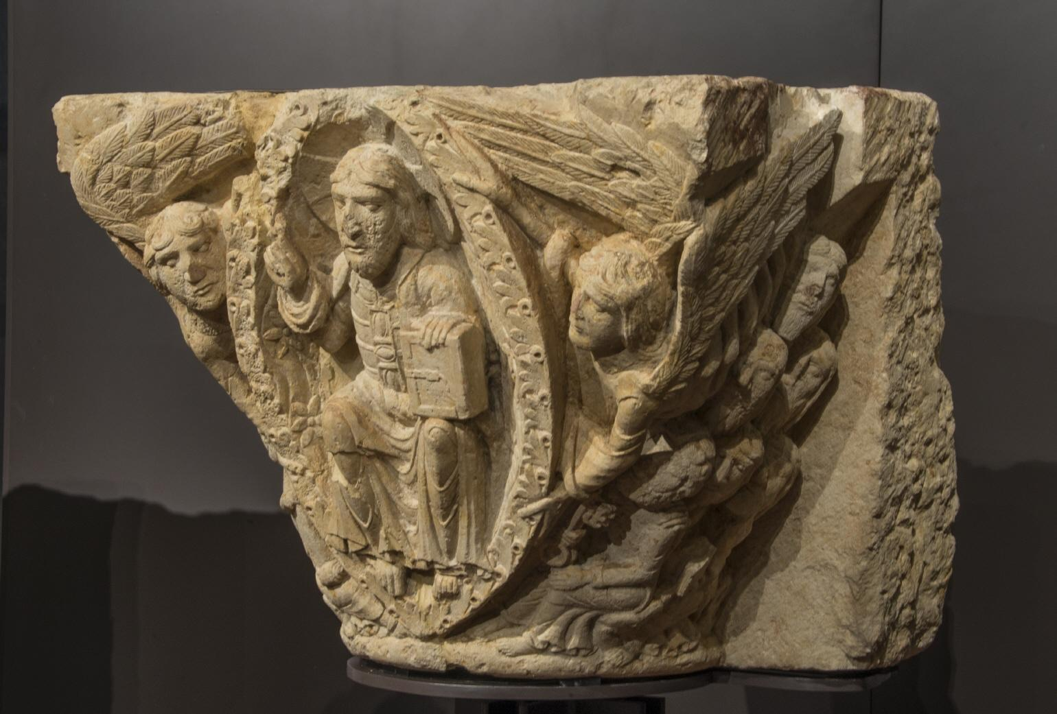 Este capitel, de gran calidad escultórica, se situaba en el arco toral de la iglesia del monasterio de Santa María la Real, completando el ciclo de la Muerte y Resurrección de Cristo.