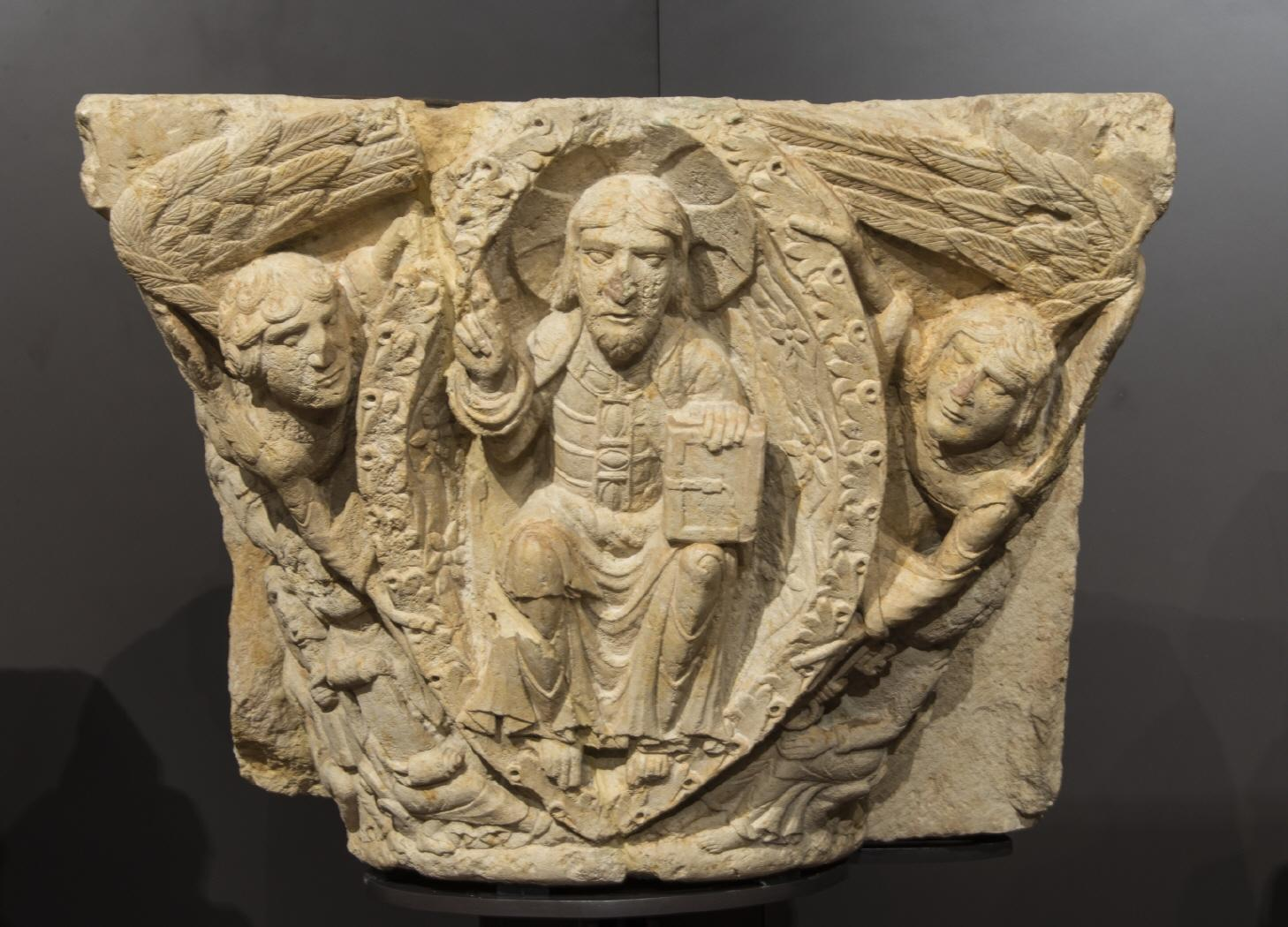 La mandorla, enmarcada por motivos vegetales tallados con trépano, presenta en su interior líneas onduladas concéntricas y cinco rosetas hexapétalas, elementos que evocan la imagen del Pantocrátor de la iglesia de Santiago de Carrión de los Condes, estableciendo así un vínculo formal y simbólico con una de las representaciones más emblemáticas del románico hispano.