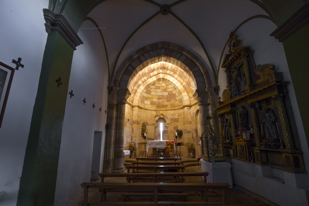 Ya en el interior, el arco triunfal que separa la nave de la cabecera destaca por sus magníficos capiteles decorados. A la derecha, el capitel representa la escena de Daniel en el foso de los leones, capturando el instante en que los animales lamen los pies de un Daniel en actitud orante. Al otro lado, otro capitel muestra cuatro grifos que se entrelazan con hojas de acanto. Tallados en piedra dolomía, ambos presentan una calidad superior a los demás y muestran la influencia del taller que trabajó en Vallespinoso de Aguilar y Rebolledo de la Torre. El retablo barroco que presidía el ábside fue desplazado a su ubicación actual en época moderna, para permitir que se apreciara la estructura románica original.