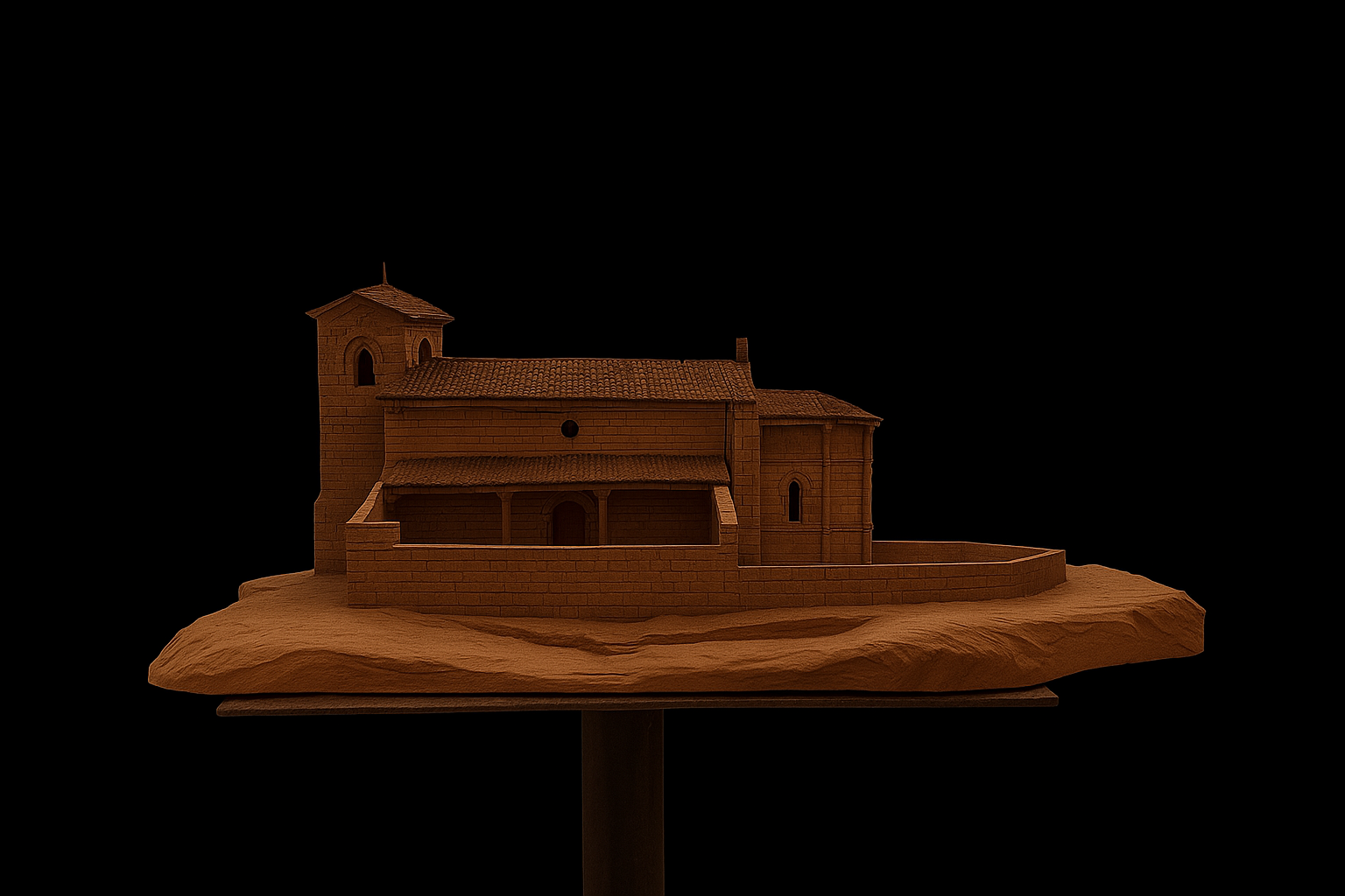 Te invitamos a que recorras el templo, incluso en esta maqueta, para descubrir su armoniosa estructura y a que, si tienes ocasión, te acerques a Villanueva de la Torre para contemplarla en su emplazamiento real. Rodear el edificio permite admirar uno de sus elementos más destacados: la potente torre-campanario. De planta rectangular, muestra similitudes con las burgalesas de Vizcaínos de la Sierra y Jaramillo de la Fuente, con un cuerpo superior utilizado como campanario y vanos geminados en sus cuatro lados.