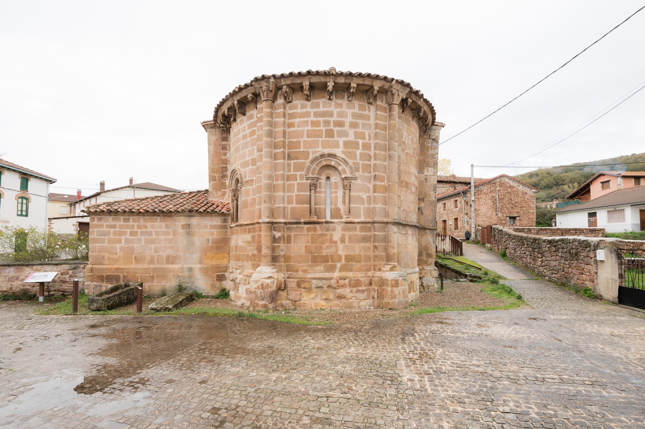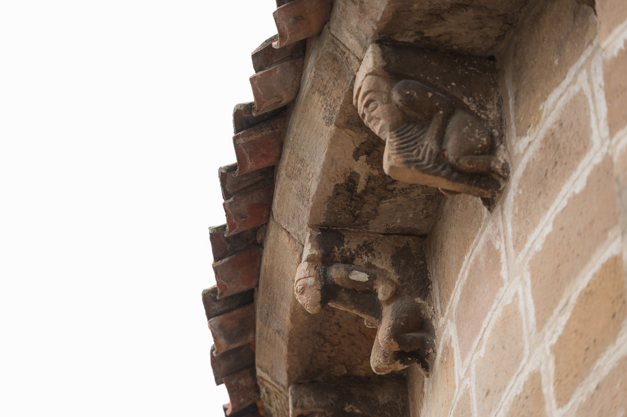 El ábside, de piedra arenisca dorada, se divide en tres paños verticales separados por semicolumnas que culminan en capiteles. En los paños central y meridional se abren ventanas de medio punto rodeadas por arquivoltas apoyadas en columnas con capiteles decorados con motivos vegetales. Si levantas la vista hasta la cornisa, podrás ver una serie de canecillos con una sorprendente variedad iconográfica: músicos, guerreros, acróbatas, exhibicionistas y animales fantásticos.